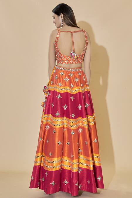 Orange high-waist lehenga with mirror embellished motifs. Comes with blouse and sheer dupatta.