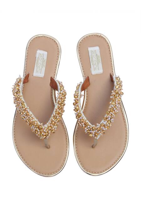 Gold sandals with ghunghroo, bead worked v-strap & stack heels.