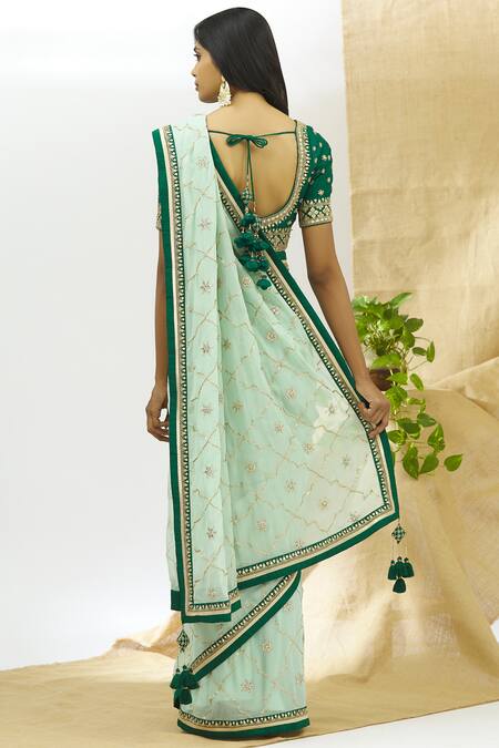 Green saree featuring all-over gota patti work with an embroidered border. Paired with a round neckline blouse with back latkan tie-up and side zip closure.