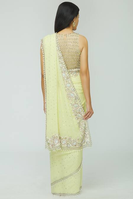 Lime yellow saree with embellished sequins all over. Paired with checkered detail blouse.