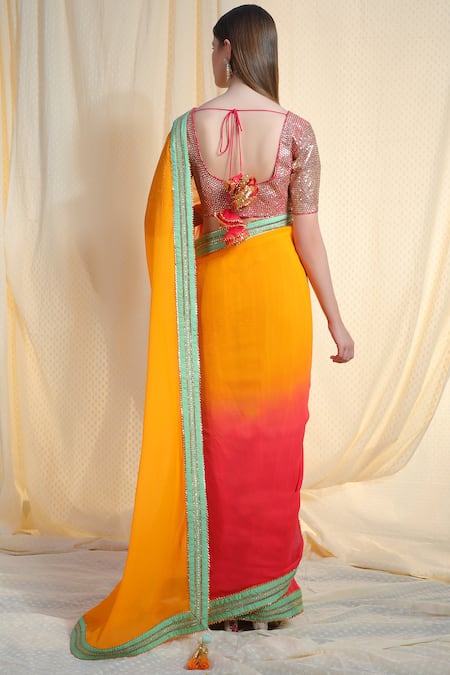 Multicoloured saree with embellished hem & tassel detail. Paired with embellished blouse.
