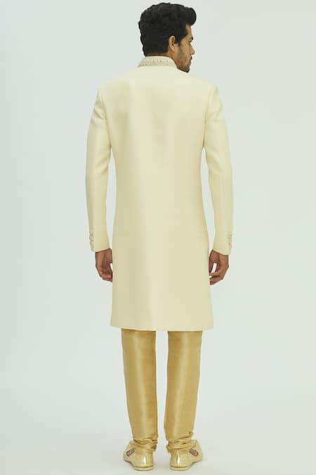 Off white sherwani with zardozi embellished band collar & welt pocket. Comes with gold churidar.