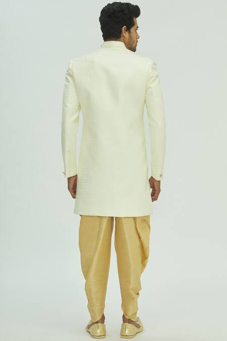 Off white asymmetrical sherwani with zardozi embellishment & welt pocket. Comes with gold dhoti pants.