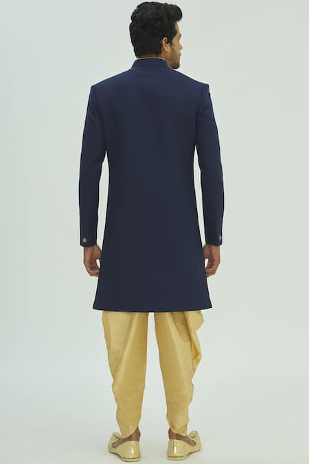 Blue sherwani with zardozi embellished floral motifs & welt pocket. Comes with gold dhoti pants.