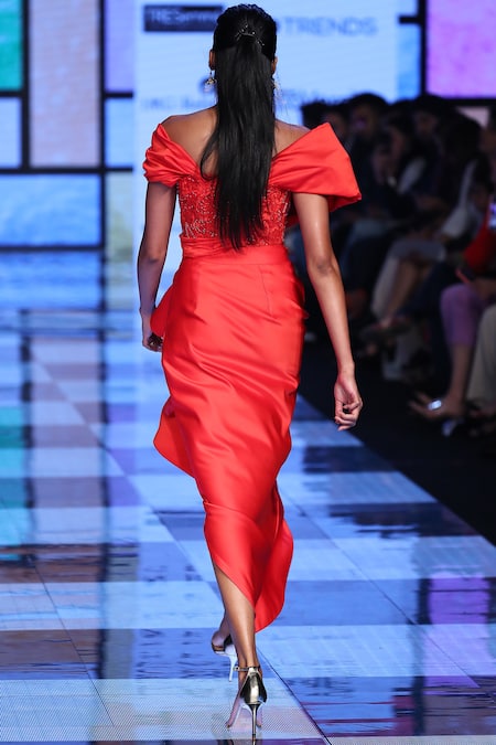 Red top with embroidered motifs & sequin work. Comes with ruffled asymmetrical skirt.