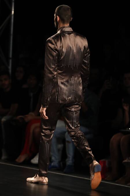 Buy_Manoviraj Khosla_Brown Satin Blend Embellished Suit And Trouser Set_at_Aza_Fashions