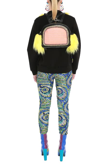 Blue & black sweatshirt with front peacock feather motif sequin work.
