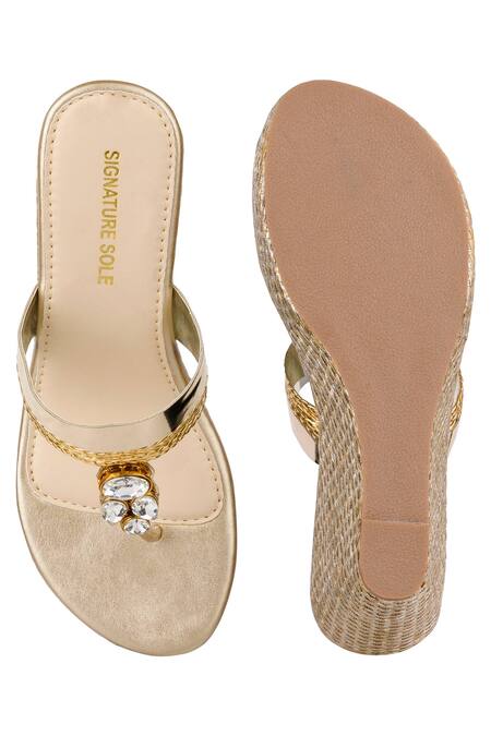Buy_Signature Sole_Gold Embellished T-strap Wedge Heels_Online_at_Aza_Fashions