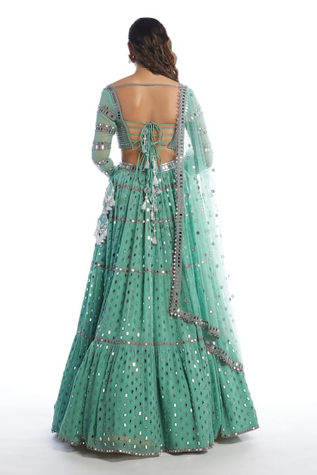 Dull mint lehenga with all-over mirror embellishments & gathered tiers. Comes with cutwork sleeve hem blouse & dupatta.
