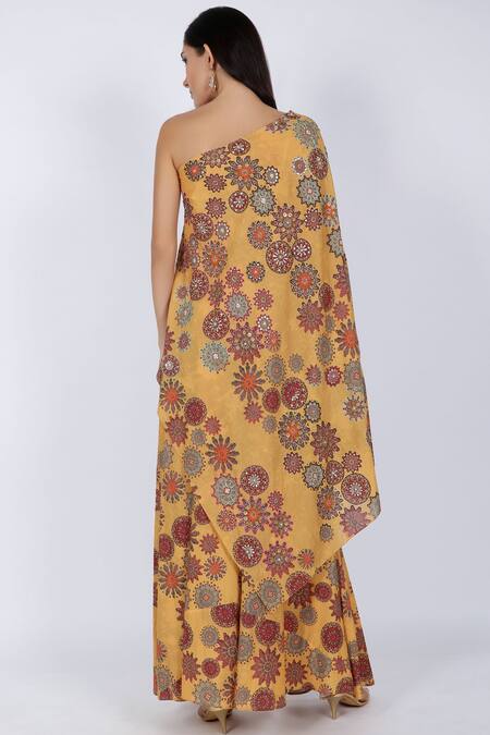 Yellow one shoulder top with embellished floral motifs & asymmetrical hem. Comes with matching palazzo pants.