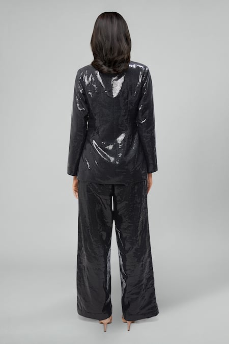 Black Georgette Sequins Open , Square Jacket Pant Set