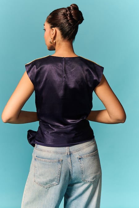 Navy blue embellished tie-up top featuring a sleek silhouette and a front tie detail.