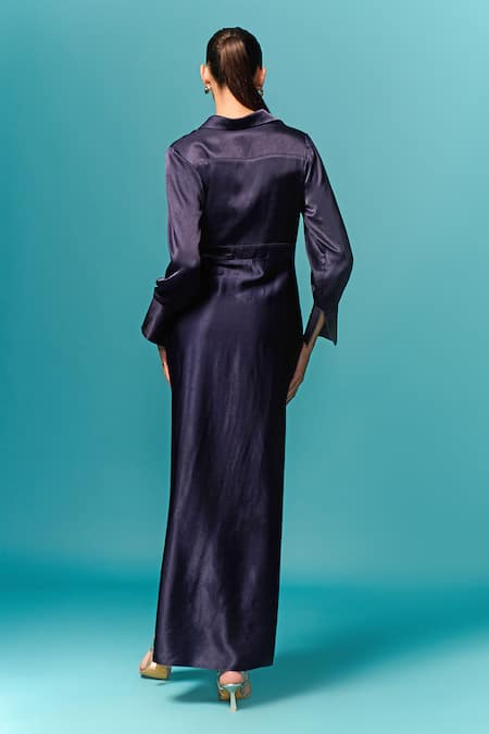 Navy blue solid draped dress featuring asymmetric panels and a shirt collar