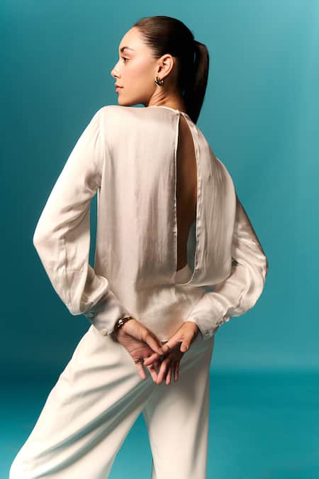 White shirt made from modal satin featuring a tie-up detail at the waist. Paired with embellished pants that have a zip closure.