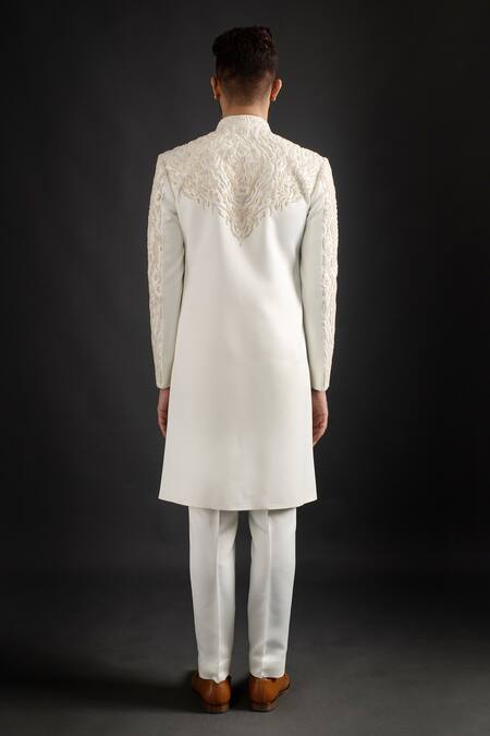 Ivory achkan highlighted with pearl-beads hand embroidery, concealed placket and full sleeves. Comes with trousers.