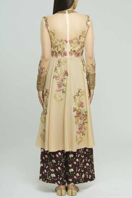 Beige anarkali with placement floral work. Comes with all over floral print palazzo and dupatta.