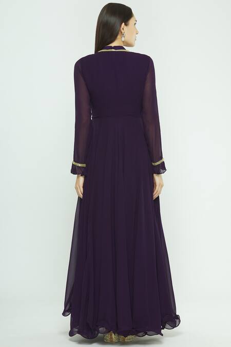 Purple Organza, Georgette Band Collar Embroidered Anarkali Set