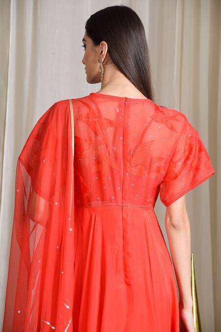 Buy_Sahil Kochhar_Orange Organza Embroidered Thread Work Round Neck Anarkali Set _at_Aza_Fashions