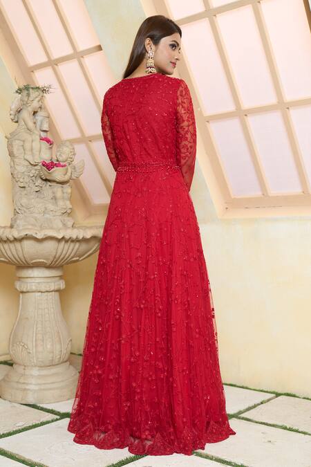 Red anarkali featuring tonal thread and sequin embroidered floral motifs. Paired with a butterfly net dupatta and modal satin churidar.
