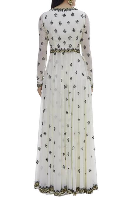 White front slit long anarkali with floral motif work paired with matching sharara & dupatta.