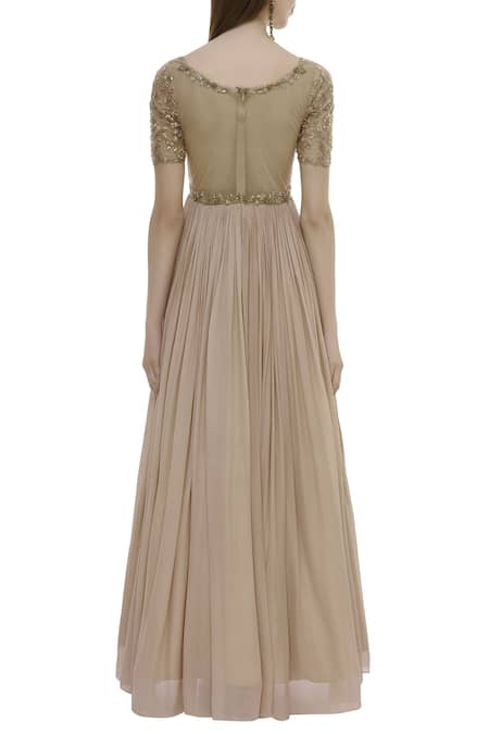 Buy_Pleats By Kaksha And Dimple_Off White Soft Net Round Neck Embroidered Anarkali With Dupatta_Online_at_Aza_Fashions