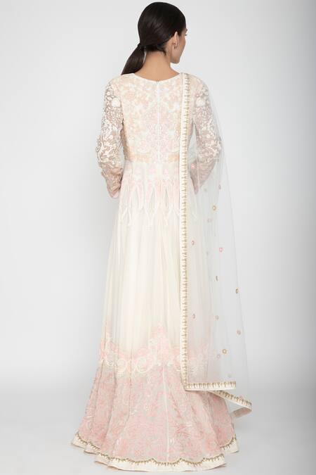 Ivory kalidar anarkali with pink thread embroidery & sequin embellishments. Comes with net dupatta.