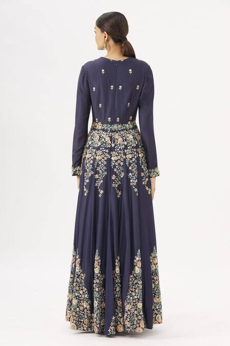 Midnight blue anarkali with floral embroidered motifs & textured bodice, polti detail. Paired with embroidered dupatta.