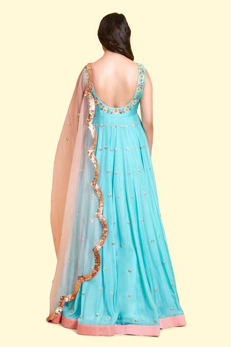 Aqua blue anarkali with all-over multi-color floral motif work & contrast hem. Comes with peach scallop border hand embroidered organza dupatta.
