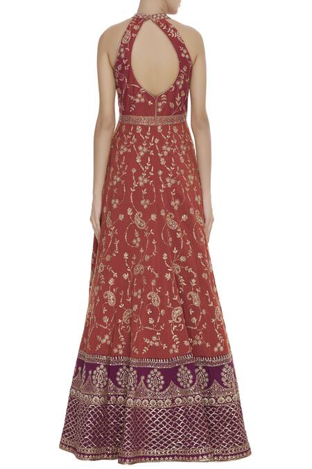 Buy_Vandana Sethi_Brown Halter Embroidered Anarkali With Dupatta _Online_at_Aza_Fashions