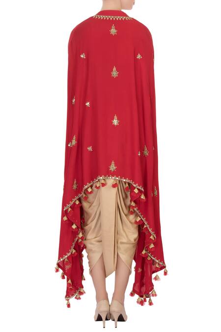 Buy_Aqube By Amber_Red Georgette Silk Embroidered Mirror Work Notched Asymmetrical Cape Tunic_at_Aza_Fashions