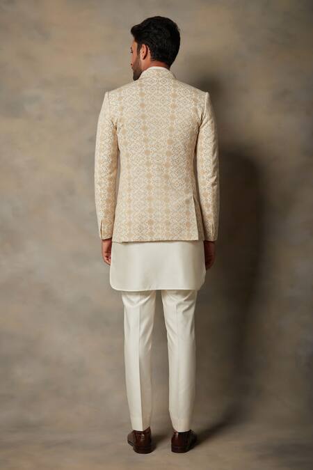 Off white, cream jacket style bandhgala with geometric embroidered motifs. Paired with cotton silk kurta & pant.
