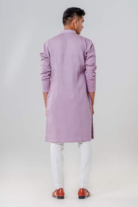 Purple kurta featuring pink threadwork bird motifs and a mandarin collar. Paired with contrasting white pant, designed with a straight silhouette and potli button placket.