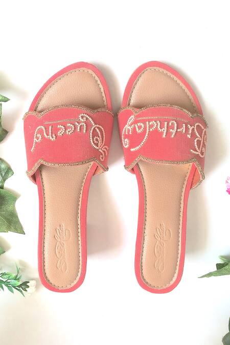 Pink block heels with bead work slogan & scallop border straps.