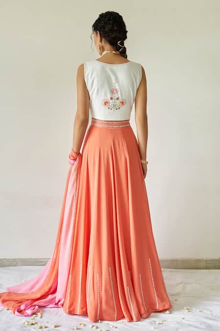 White blouse highlighted with floral sequence hand embroidery, V-neckline, potli placket and sleeveless. Comes with peach lehenga and shaded dupatta.