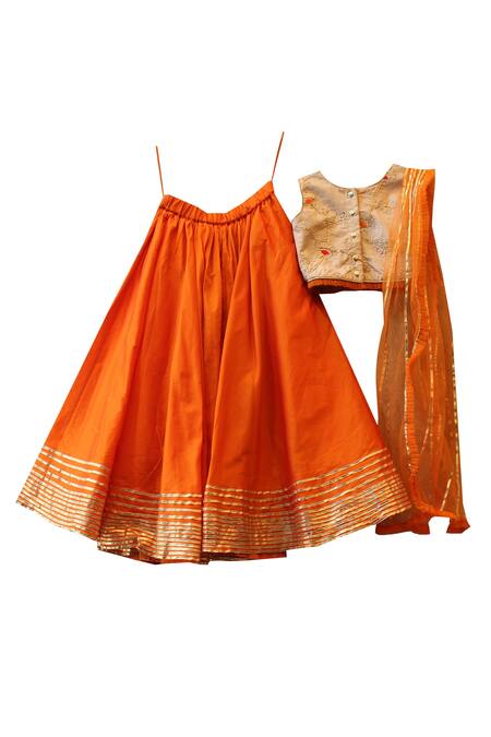 Orange lehenga featuring gota patti embroidery and pleated border. Paired with a matching dupatta and an embroidered blouse with button front closure.