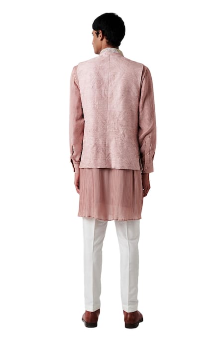 Tea rose bundi with floral embroidered motifs. Paired with pleated kurta & pant.