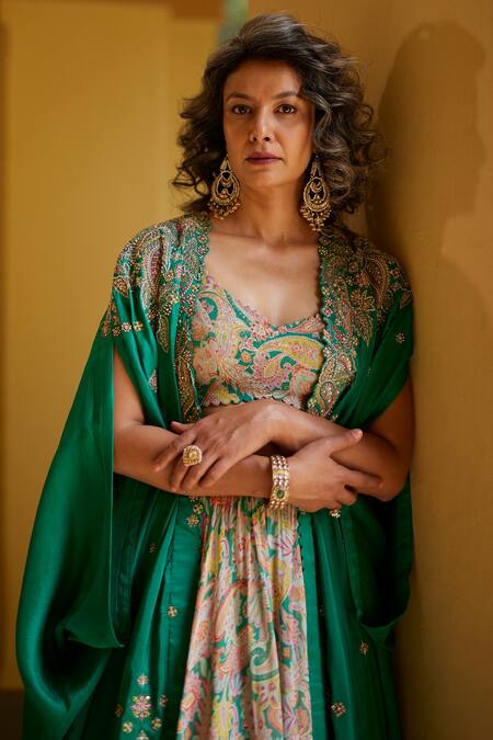 Green lehenga featuring a vintage print with resham & zardozi work. Paired with a sweetheart neck blouse and an open cape with batwing sleeves.