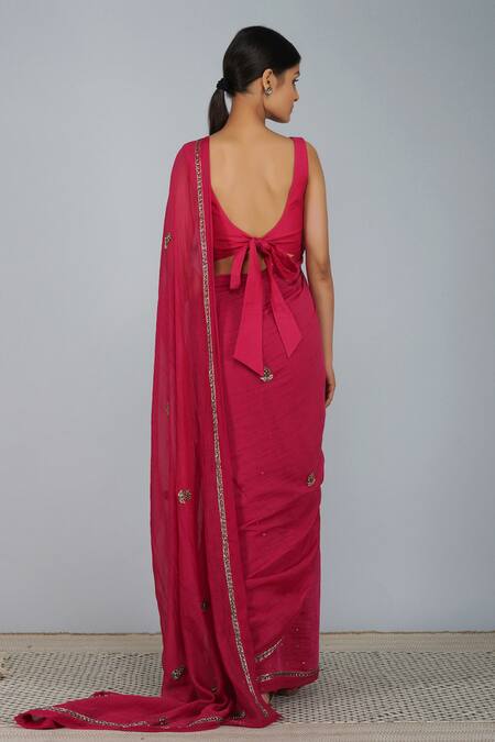 Raspberry saree with floral embroidered motifs & sequin work. Paired with unstitched blouse fabric.