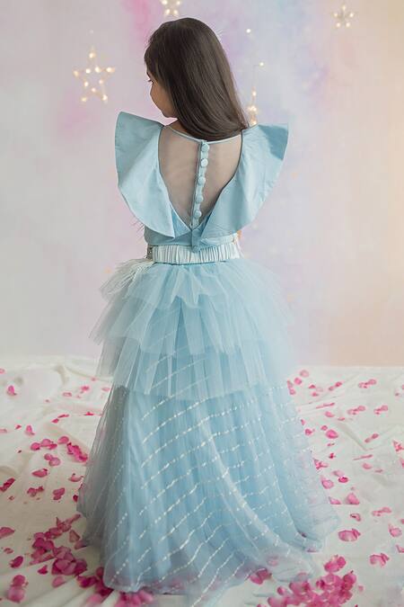 Blue Tulle Embroidered Choli And Layered Lehenga