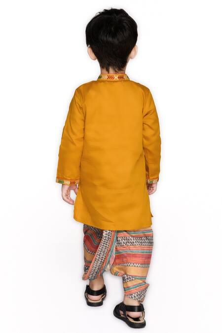 Mustard yellow kurta featuring a mandarin collar and full sleeves with thread work embroidery. Paired with a geometric print dhoti pant for a complete look.