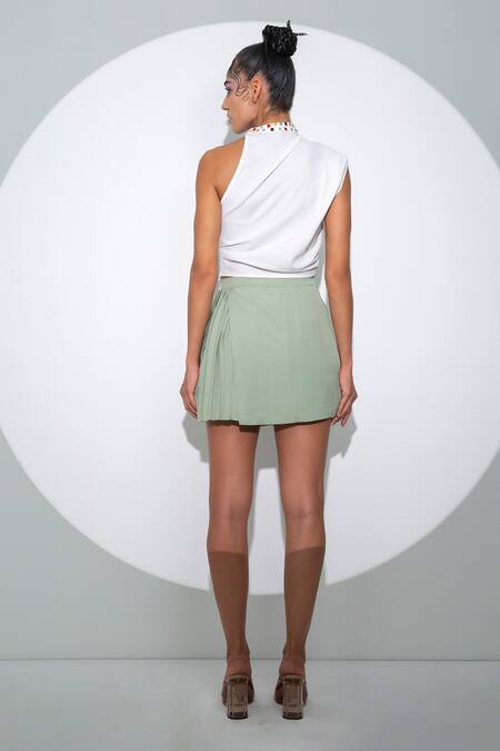 White asymmetric top featuring a high neck collar and placement collar embroidery