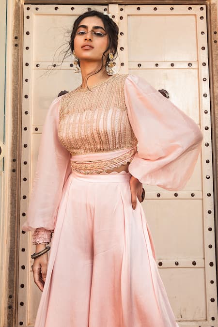 Buy_Supria Munjal_Pink Organza And Satin Georgette Bead, Sequin & Embroidered Crop Top & Pant Set_Online_at_Aza_Fashions