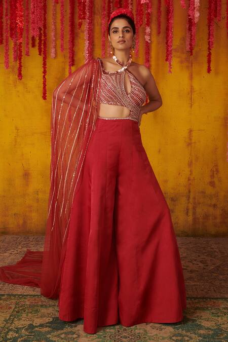 Red Net, Satin Organza Bead Work, Cutdana Work, Embroidered Draped Jumpsuit