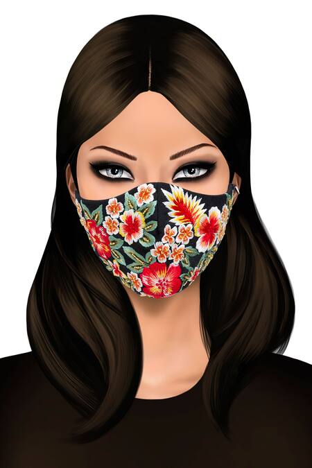 Black face mask with multicolor floral embroidery & elasticated bands.