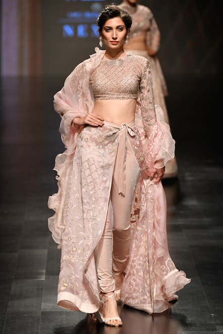 Showcasing a stunning ensemble with a quirky style this wedding season. Featuring a pink velvet pant with wrap embroidered tie-up skirt. Teamed up with check pattern embrodiered crop top with ruffle dupatta.