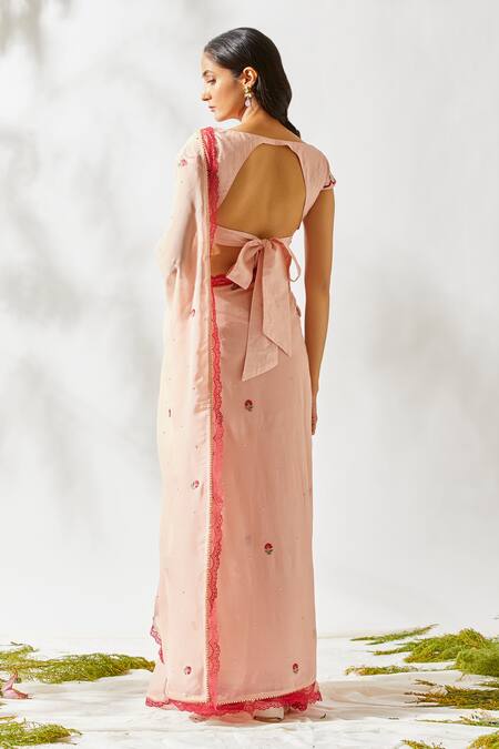 Pink saree with floral embroidered motifs & scallop lace border. Paired with unstitched blouse fabric.