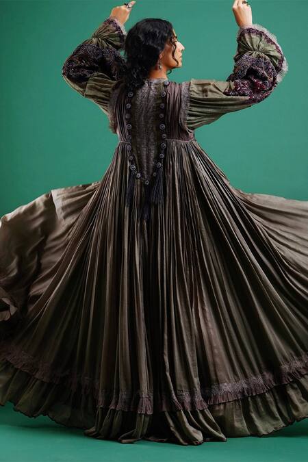 Olive green gown with cutout detail in the front and embroidered puff sleeves.
