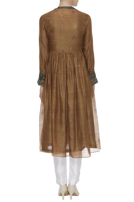 Brown Cotton Silk Embroidered Floral Collared Inner Kurta With Tunic Jacket