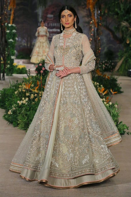 Grey front-open long jacket with all-over hand embellished pearl & cutdana. Comes with chanderi silk lehenga & embroidered dupatta.