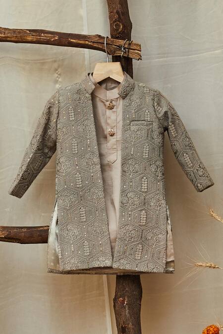 Grey geometric embroidered jacket featuring a front open design and side slits. Paired with an off-white solid kurta and pajama, this set is made from cotton silk and Bangalore silk.